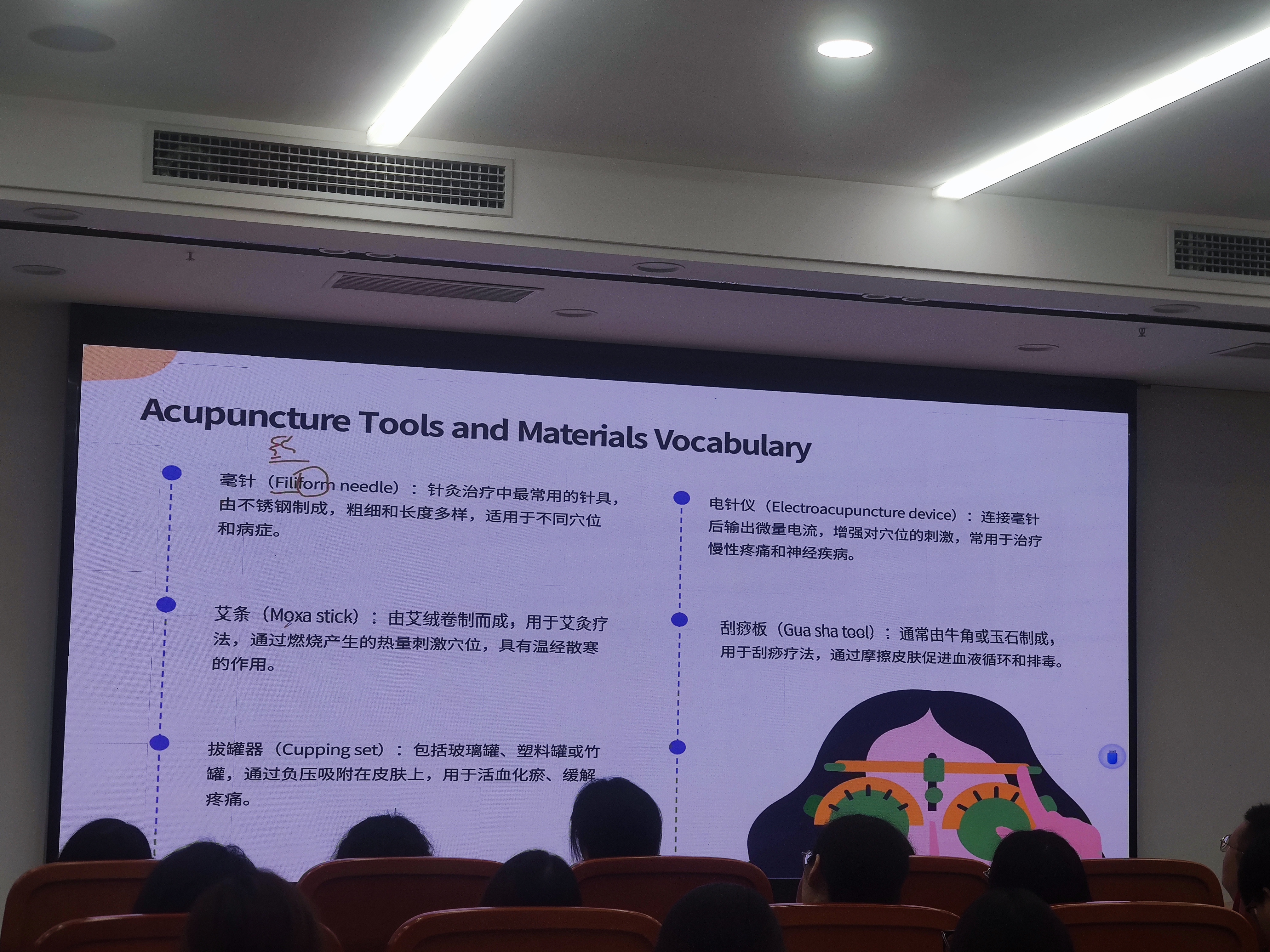 讲座中,张娅婷深入浅出地剖析了针灸术语的精准英译,并分享了如何用简洁地道的英语,向不同文化背景的听众阐释针灸的核心理念与操作原理。现场互动热烈,气氛活跃。