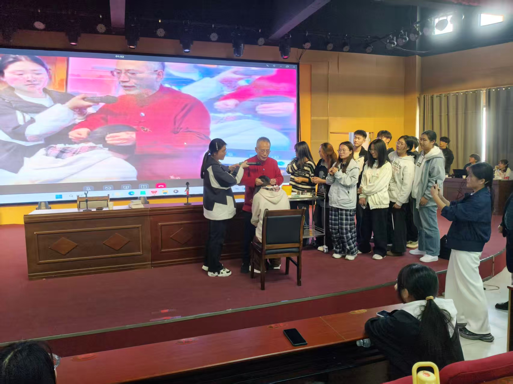 活动伊始,江林老师邀请在场学生上台体验特色针法,并提出相关问题与在场学生进行互动。在实践理论方面,他阐述了“合担合截气贯双针”中涉及“平衡阴阳”和《黄帝内经》“不通则痛”的概念,对该技艺的独特针法进行了讲解。在中医药传承创新方面,他向同学们介绍了中国针灸名家承淡安,着重讲解了“淡安精神”,并强调其独特内涵与价值。他强调,针灸与西医同样具有科学性,鼓励在场同学们勤奋学习,努力成为理论基础扎实、实践技艺熟练的新时代中医药人才。
